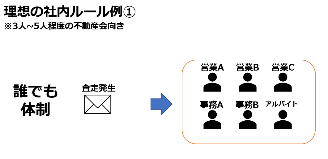 集約型とは、発生した反響をまずは店長などの責任者が一括して受け取り、物件のエリアや想定されるグロス(価格)を見て、「高額な物件だからベテランのBさんに」「このエリアは若手のCさんに」と都度割り振るルールです。