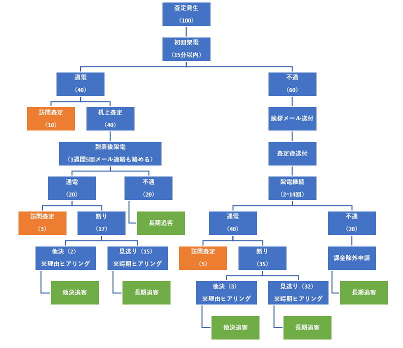弊社が推奨している初期対応の目標値は、「通電率80%」「対応時間30分以内(理想は数分)」「訪問査定率10%」です。