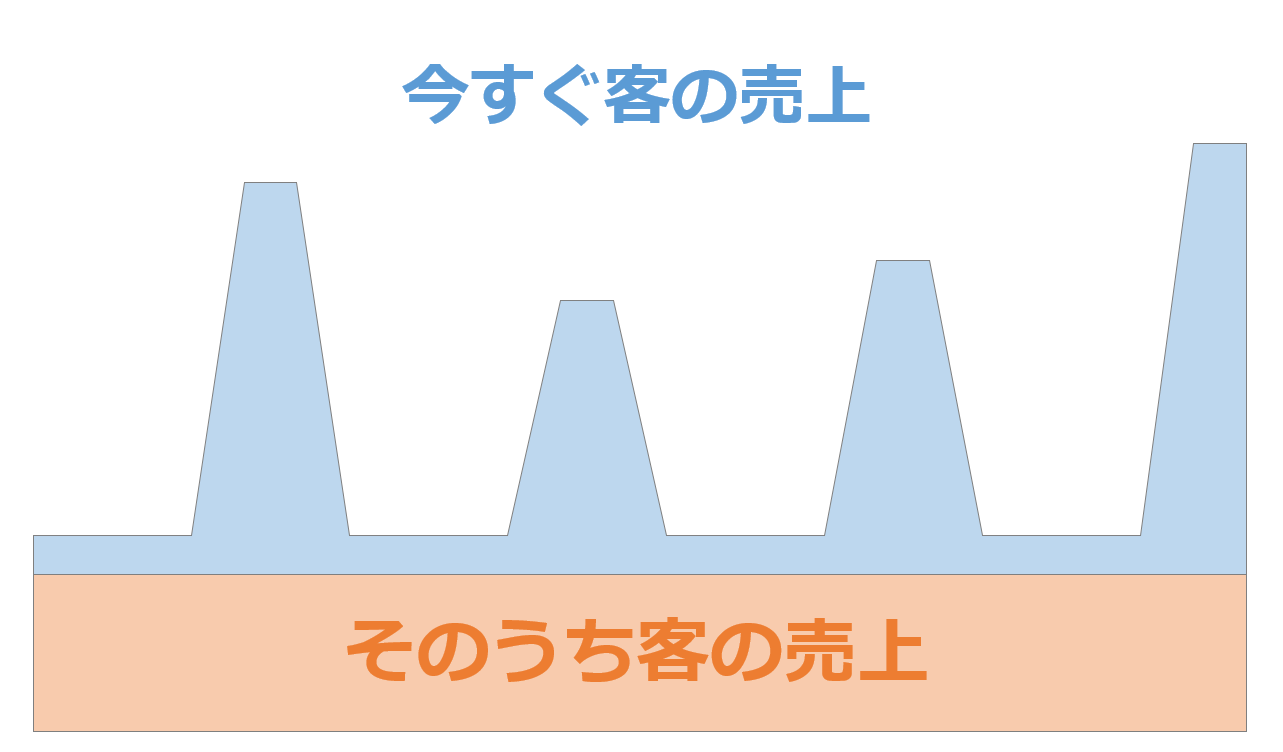 単月で見れば小さな成果かもしれませんが、年間を通してみると「今すぐ客」から得られる売上に匹敵、あるいはそれを凌駕するほどの巨大な売上の山となる可能性を秘めているのです。